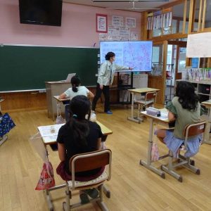 その後、地域の方が、きれいに耕してくださった畑に大豆を植えました。小動物に見つかって食べられないように、しっかりと穴を掘って2粒ずつ入れました。2粒ずつ撒くと大豆は互いに競争しあい、よりすくすくと成長するそうです。