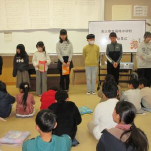 今日は朝から雪が降り、冬らしい日となりました。体育館での終業式は気温が低いので、音楽室で行いました。最初に各学年の代表の児童が2学期の思い出やがんばったことを発表しました。子どもたちの発表から、この2学期とても頑張り、充実した2学期であったことがうかがえました。また、図書委員会から2学期にたくさん本を読んだ児童の表彰がありました。子どもたちが本に興味をもって読書をしていることは素晴らしいと思いました。