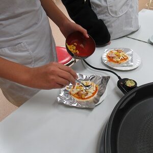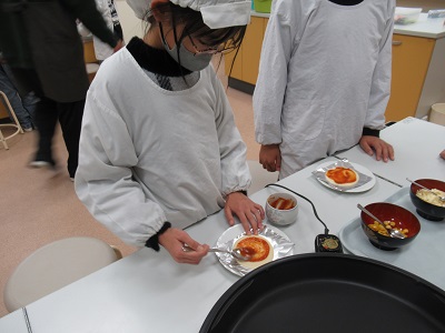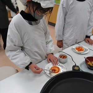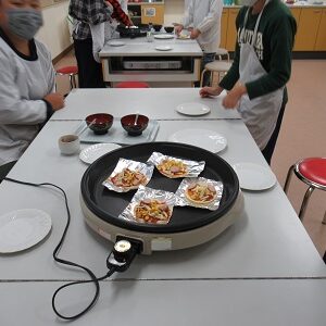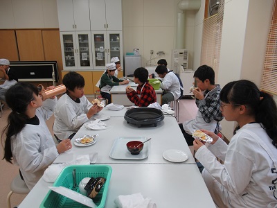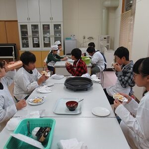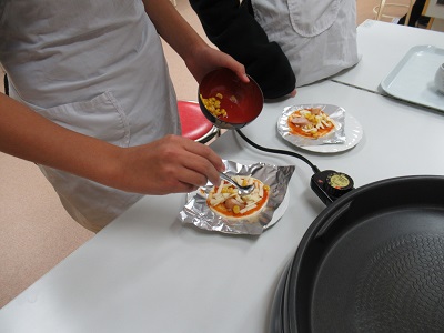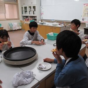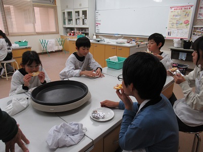 今回の4・5・6年生のクラブ活動は「ピザづくり」でした。地域の山内さんに来ていただいて、子どもたちと一緒に作っていただきました。はじめに、ピザの生地にピザソースをぬって、その上にウインナーやコーン、チーズをちりばめました。そして、ホットプレートで10分焼けば完成です。子どもたちは手際よく作ることができ、「とってもおいしかった」と感想を述べていました。また、おうちでも作ってほしいと思います。ご多用のところ、ご指導いただきました山内さん、ありがとうございました。