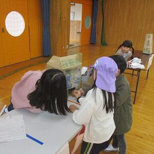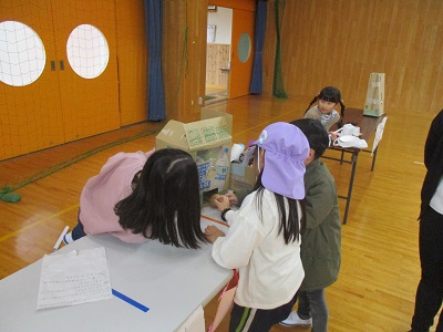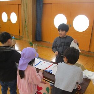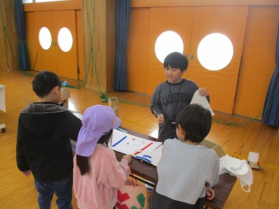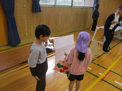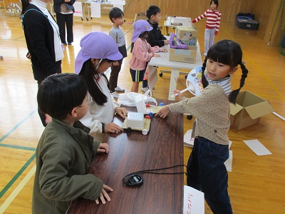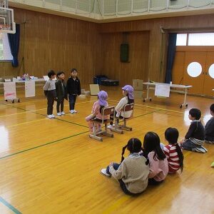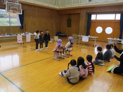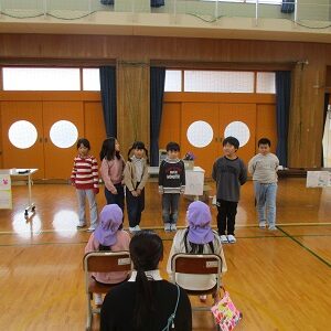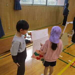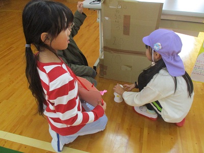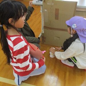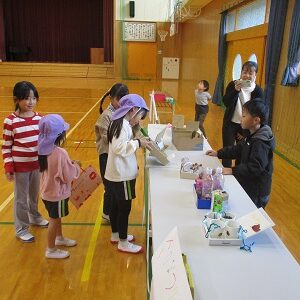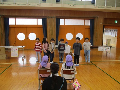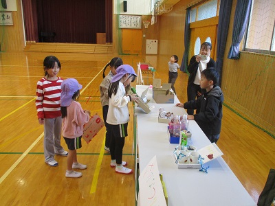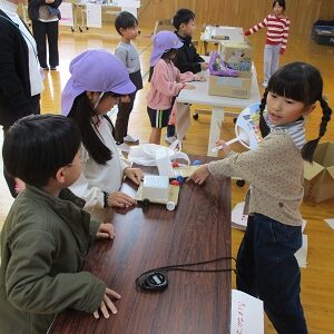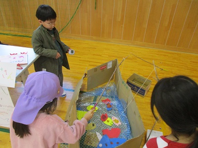 来年度入学予定の園児の皆さんと1・2年生の児童が交流会を行いました。1年生は「あきのおもちゃやさん」、2年生は「おもちゃランド」を開き、自分たちが作ったおもちゃで、園児の皆さんと一緒に遊びました。1・2年生は、「自分たちが作ったおもちゃで園児の子たちがたのしく遊んでくれたので、とてもうれしかった」といっていました。来年の入学式を楽しみにしています。