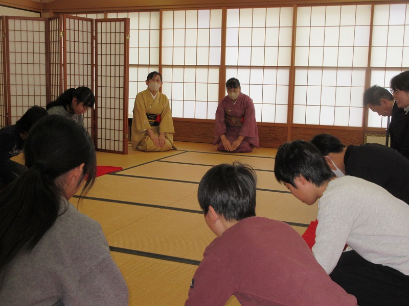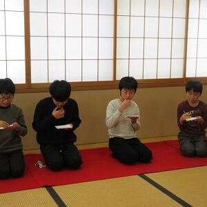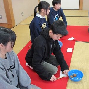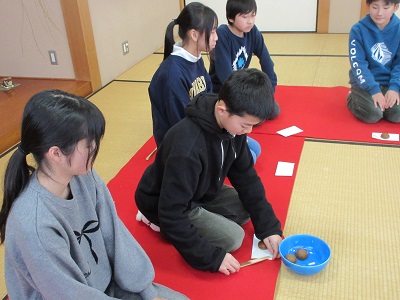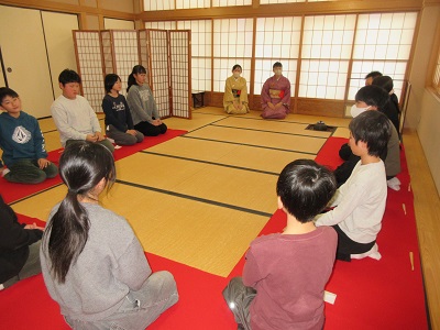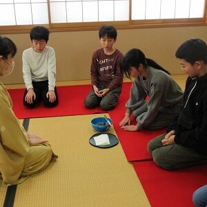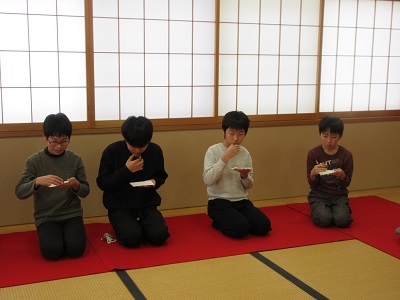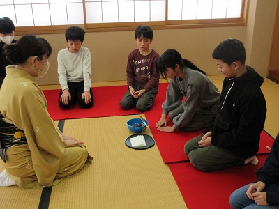 新年を迎え、初めての茶道体験学習です。今年も「初釜」の体験をさせていただきました。「新寿」のお軸に松の枝、柳の木と新春らしい床の間を講師の先生に準備していただきました。子どもたちは心を落ち着かせ、丁寧にお辞儀をする所作は本当に素晴らしかったです。子どもたちが見守るなか、講師の先生の見事なお点前を拝見し、お茶席での作法を学びました。先生に点てていただいたおいしいお茶をいただき、素敵なお稽古始めとなりました。講師の先生方、ありがとうございました。