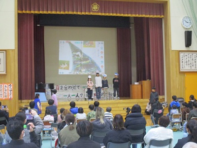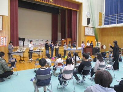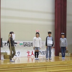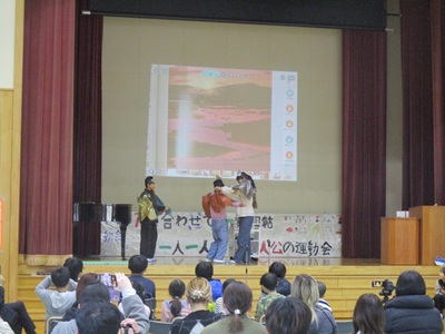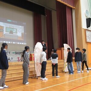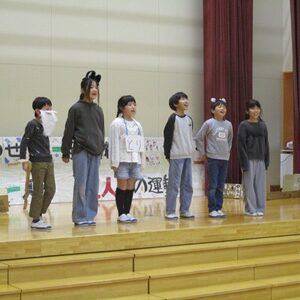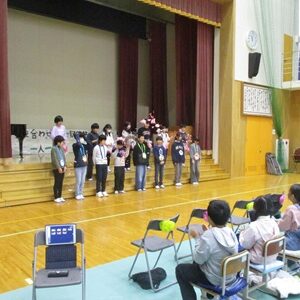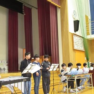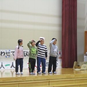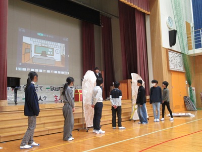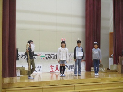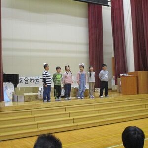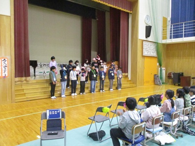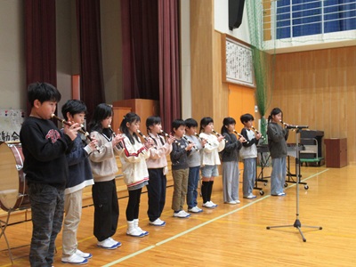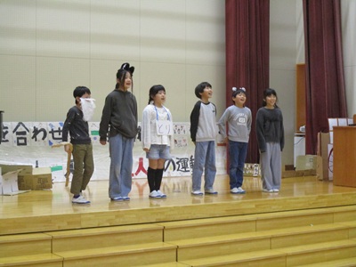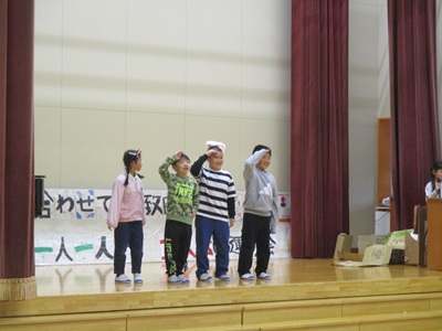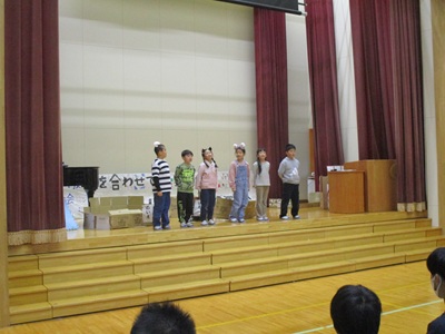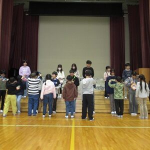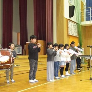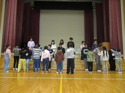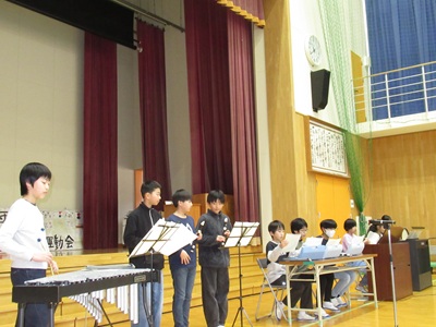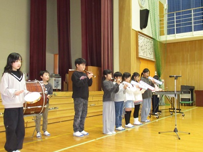 「6年生を送る会」を行いました。4・5年生が中心となって、会を運営しました。はじめに、全校児童で「フレフレ大丈夫!」を合唱しました。この日のために朝の会で練習しましたので、みんな大きな声で合唱できました。次に、学年ごとに劇やお祝いメッセージの発表をしました。どの学年の劇もユーモアを交えた内容で、観客からは笑いが起こるなど、温かく心のこもった発表でした。次に、3・4年は「オーラリー」「ミッキーマウスマーチ」、5・6年は「もののけ姫」「ジュラシックパーク」の合奏を行いました。音楽の時間にたくさん練習したので、とても美しい合奏ができました。最後に6年生が「目指せ!みんなで卒業!」の劇で、感謝の思いや中学校入学に向けての希望を発表しました。子どもたち、みんなの力で、素晴らしい「6年生を送る会」になりました。ありがとうございました。